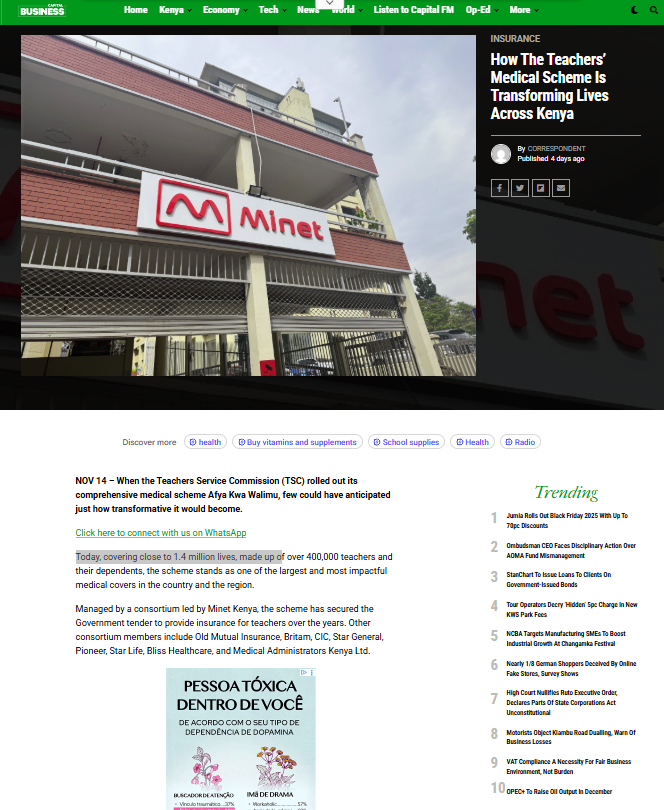 NOV 14 – When the Teachers Service Commission (TSC) rolled out its comprehensive medical scheme Afya Kwa Walimu, few could have anticipated just how transformative it would become.