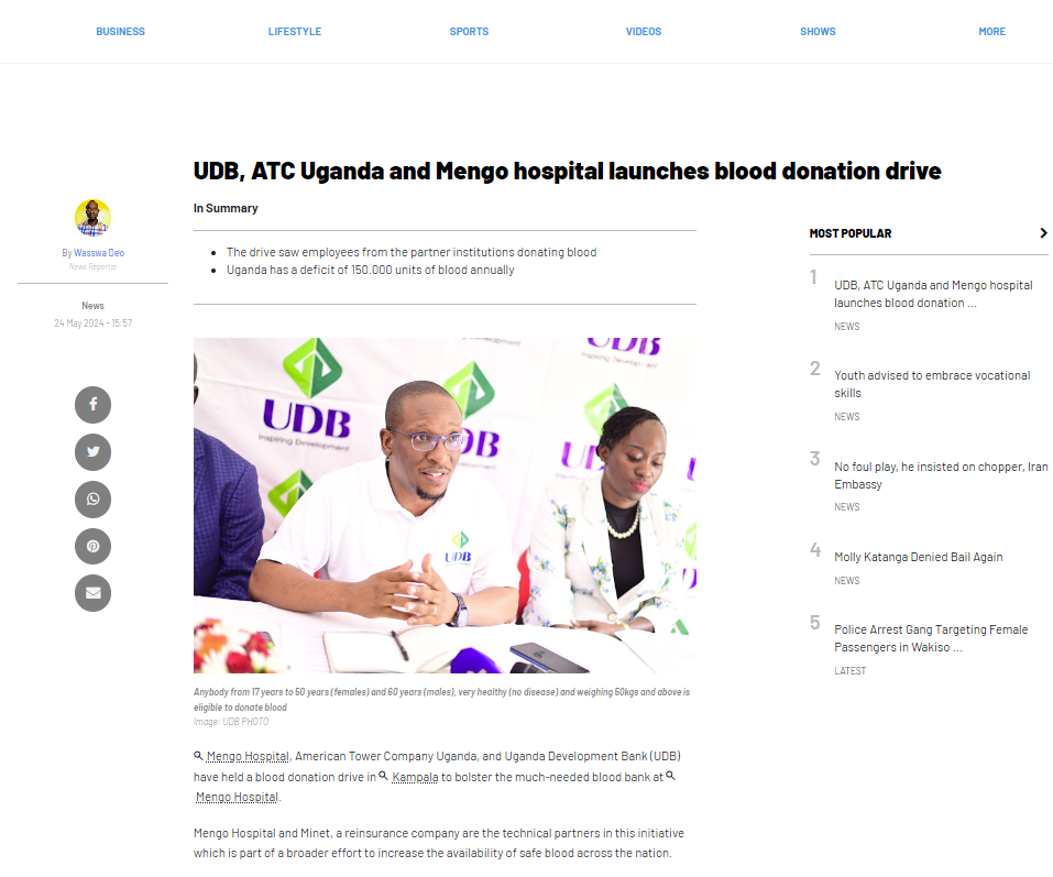 Mengo Hospital, American Tower Company Uganda, and Uganda Development Bank (UDB) have held a blood donation drive in Kampala to bolster the much-needed blood bank at Mengo Hospital.